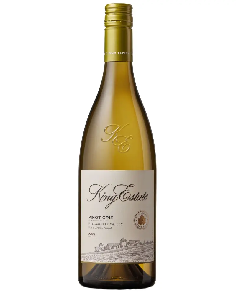 King Estate Pinot Gris Willamette Valley. Classic hallmarks of Pinot Gris appear on the nose with aromas of ripe pear, lime zest, peach, honeysuckle and lemon blossom. The wine starts off nice and round on the palate with ripe fruit flavors of Asian pear, key lime and nectarine accompanied by jasmine and damp slate. The entrance is followed by bright acidity that carries through to a fresh, balanced and lingering finish.